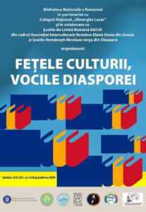 Biblioteca Naţională a României în parteneriat cu Colegiul Naţional Gheorghe Lazăr din București, în colaborare cu Scoala de Limba Romana Dacia din Atena și Acharnes , Școala Internațională de Limba Română Dacia- Cursuri Online, Asociaţia Interculturală Româno-Elenă DACIA și Scoala Romaneasca „Nicolae Iorga”, Liverpool, Scoala românească „Nicolae Iorga” Birmingham organizează evenimentul FEȚELE CULTURII, VOCILE DIASPOREI.