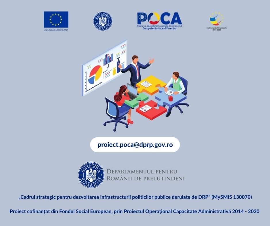 Departamentul pentru Românii de Pretutindeni desfășoară proiectul „Cadrul strategic pentru dezvoltarea infrastructurii politicilor publice derulate de DRP” (MySMIS 130070 / SIPOCA 730), cofinanțat din Fondul Social European prin Programul Operațional Capacitate Administrativă 2014 – 2020.